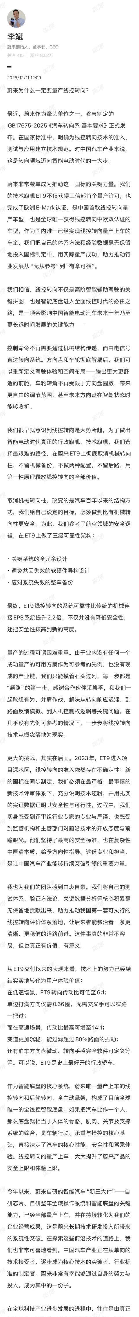 蔚来创始人李斌更是亲自撰文,详解了为何要啃下这块硬骨头。这不仅是蔚来自身的技术突破,背后更关联着一项刚刚发布的国家标准,以及中国汽车产业在智能化底层技术上的一场关键竞速。